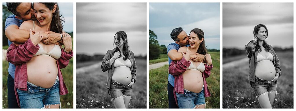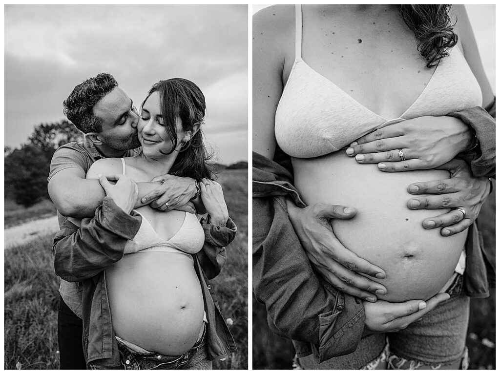 If you really don’t like a dress, you don’t have to wear one! These are your photos, after all, and we want them to feel authentically you! A more casual look is some great trendy jeans (you can wear your pre-pregnancy ones unbuttoned at the top) or maternity leggings with a button down or a long open cardigan and bra if you’re hoping to do bare belly photos. If you’re not into the bare stomach look, a flowy tunic, loose off-shoulder sweater, or baby doll style top that allows for draping are a great alternative. These looks will give us similar benefits to a maxi dress while helping you feel confident and like yourself.